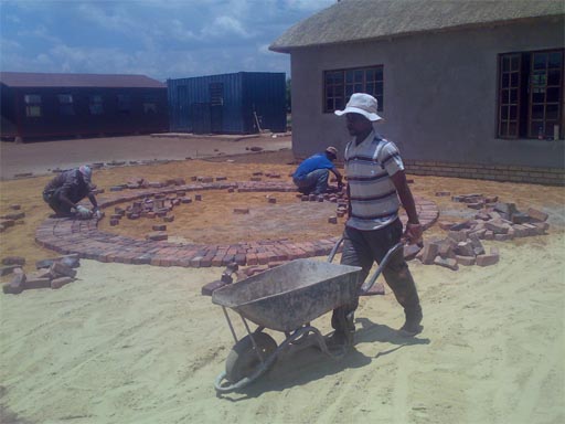 Community members with PS Staff (General workers) laying paving for the school. Bricks are collected from Brick Veld for free since they are regarded as Scrap.